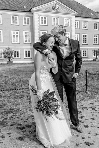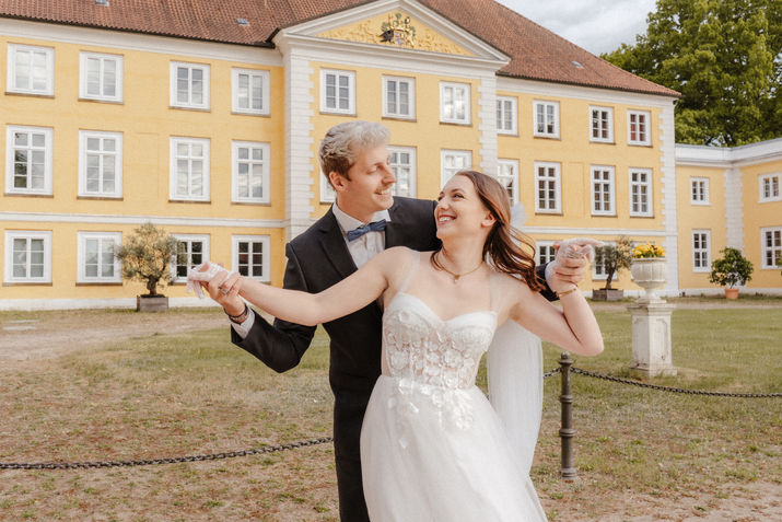 Wie aus einem modernen Märchen – Verena & Marvin am Schloss Wotersen. Diese Kulisse hat eine besondere Wirkung: majestätisch, zeitlos und voller Geschichte. Und mitten darin die beiden – strahlend, elegant, ganz bei sich.